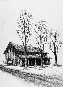 | Typically I draw on cold-press illustration board or heavy-ply bristol board , in india ink using a crow quill or hawk quill nib (the self portrait , however,was drawn with pencil). I see order in the utilitarian shapes and in the textures and shadows of old wooden structures , implements,and objects-- and i see them disappearing apace. I record them,while I can. Shape and texture and shadow are not color-daubed subtleties to my eye. They are .... black and gray and white. Pricing on Original artwork is priced individually. Shipping and handling on all originals is $27 |